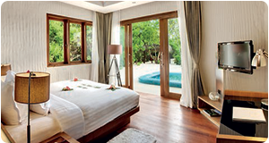 There are 103 villas and suites in the Hideaway Beach Resort and Spa, available in ten different styles. These are: Sunset Beach Villa, Deluxe Water Villa with Pool, Deluxe Sunset Beach Villa with Pool, Beach Residence with Plunge Pool, Beach Residence with Lap Pool, Ocean Villa with Pool, Family Villa with Pool, Ocean Suite with Pool, Hideaway Palace and Family 2-Bedroom Villa with Pool. All villas have the following: